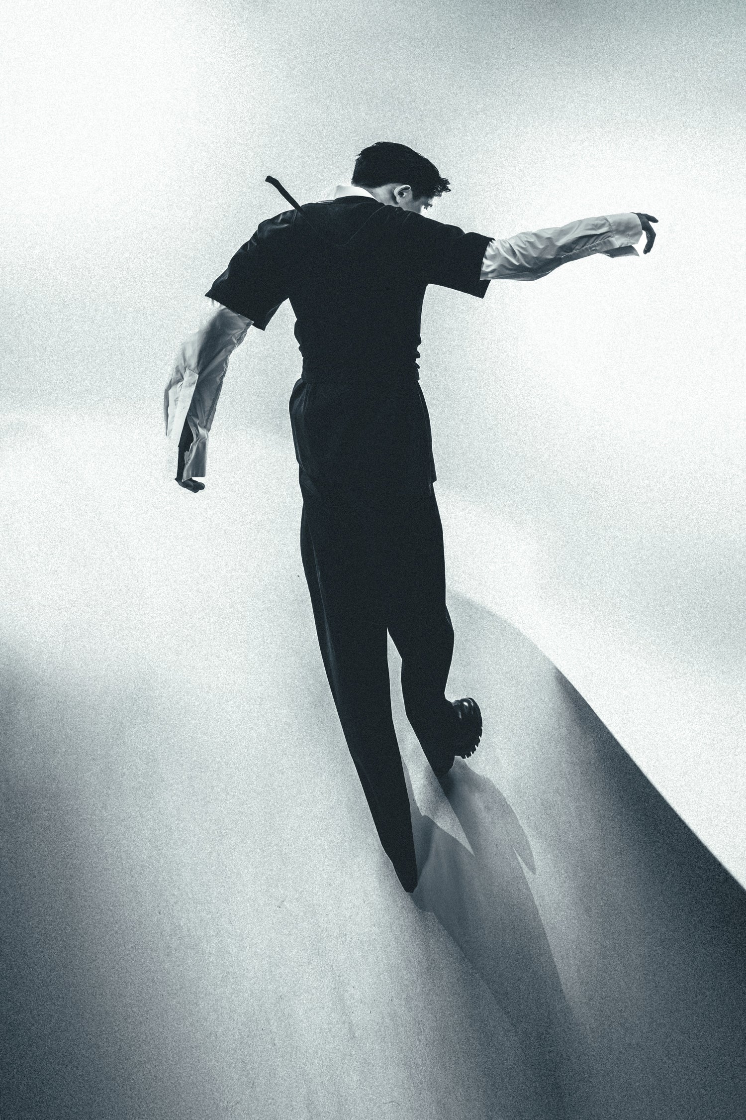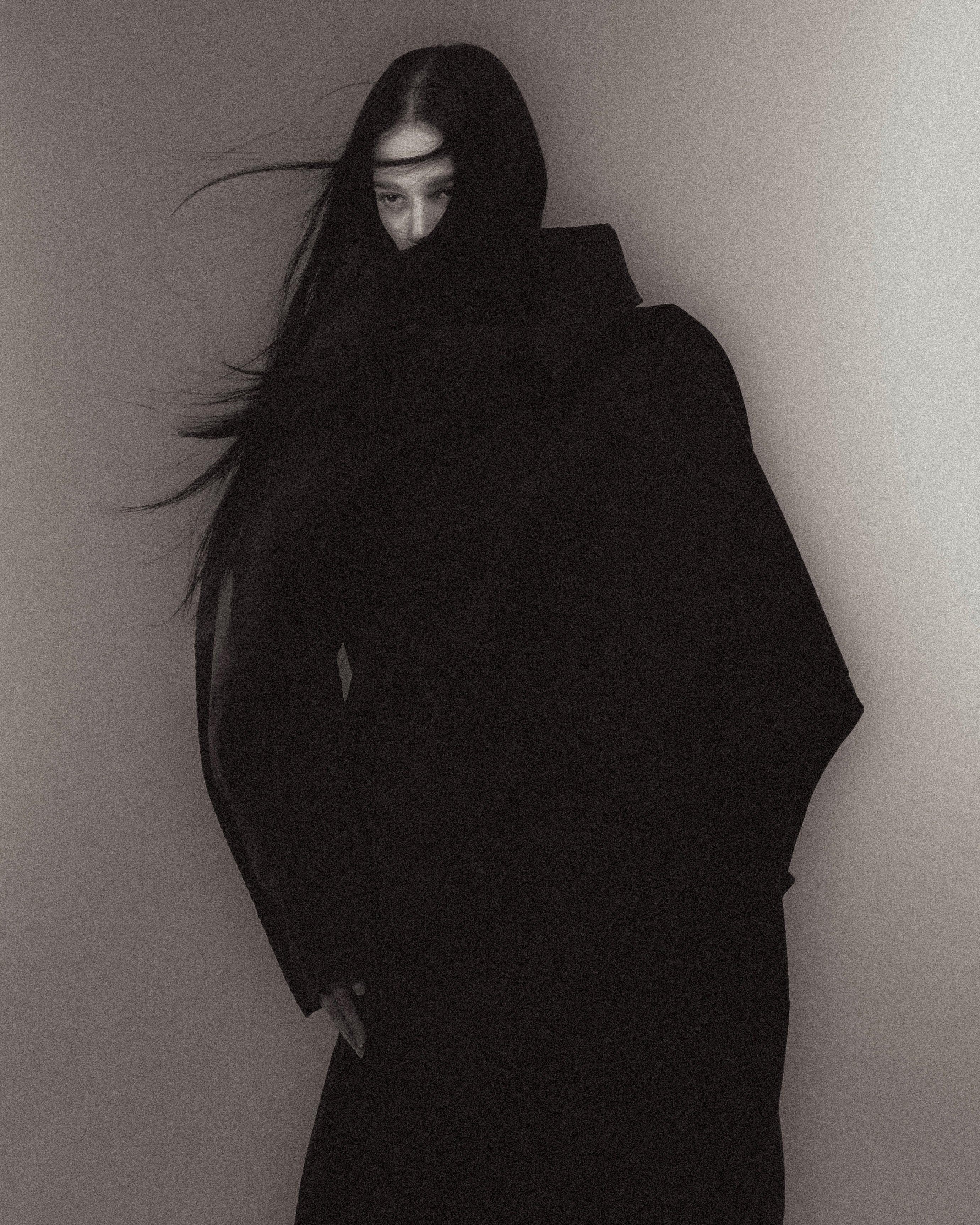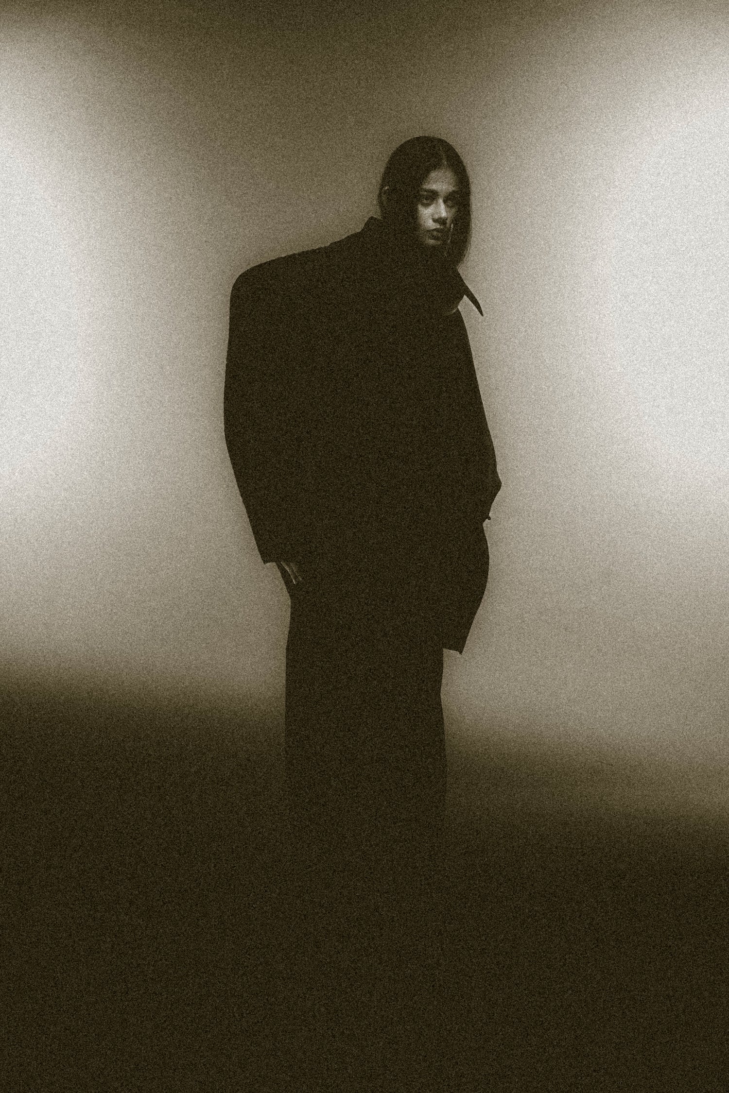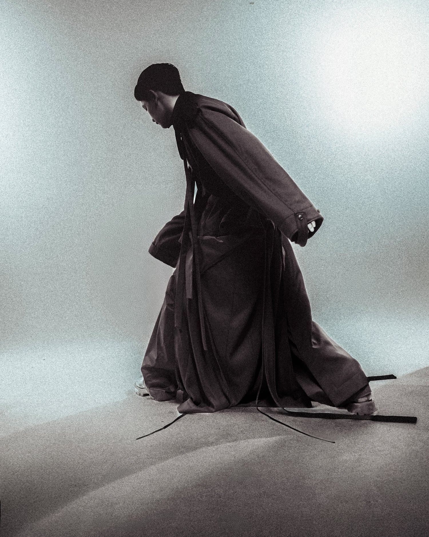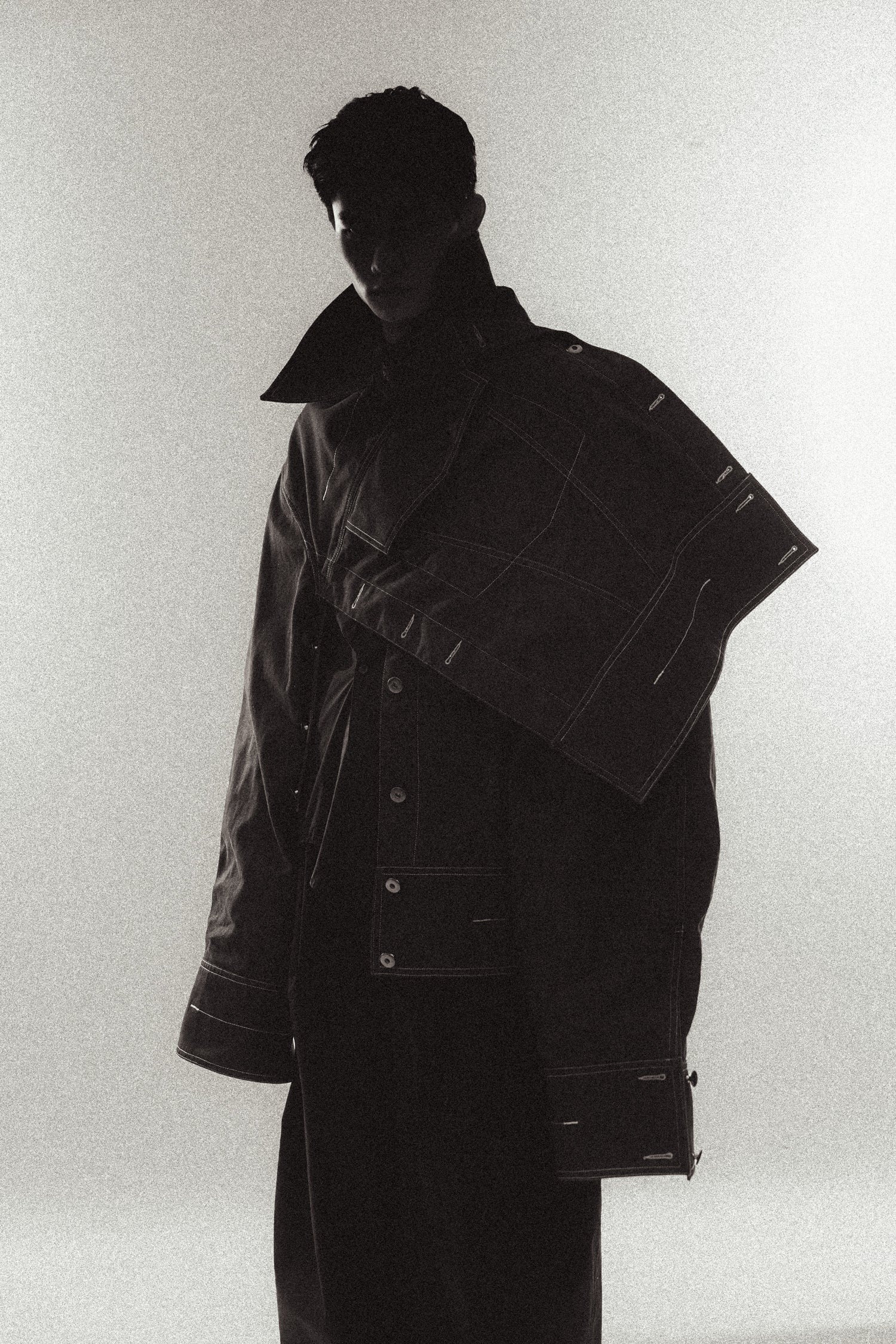 DECONSTRUCTION DRIVES THE COLLECTION’S AESTHETIC, WITH ASYMMETRICAL DESIGNS, SLANTED LINES, AND GARMENTS THAT APPEAR AS IF TWISTED BY UNSEEN FORCES. SLASHED, OFF-KILTER SILHOUETTES, STORM FLAPS, AND INTRICATE DETAILS EVOKE A SENSE OF DISRUPTION AND MYSTERY. AS THE COLLECTION PROGRESSES, SEVERE TAILORING AND EXPERIMENTATION TAKE CENTER STAGE, WITH SHARPLY CUT PIECES AND AVANT-GARDE DESIGNS REDEFINING TRADITIONAL TAILORING. SIGNATURE PIECES INCLUDE A TECH NYLON BLAZER WITH ELASTIC LOOPS, EMBODYING THE COLLECTION’S TORN ELEGANCE, AND A BOMBER JACKET WITH ASYMMETRICAL LINES AND CURVE CUTS. RTW 2024 'TORN' IS A CELEBRATION OF BEAUTY BORN FROM CHAOS, OFFERING A HAUNTING YET CAPTIVATING VISION OF FASHION.