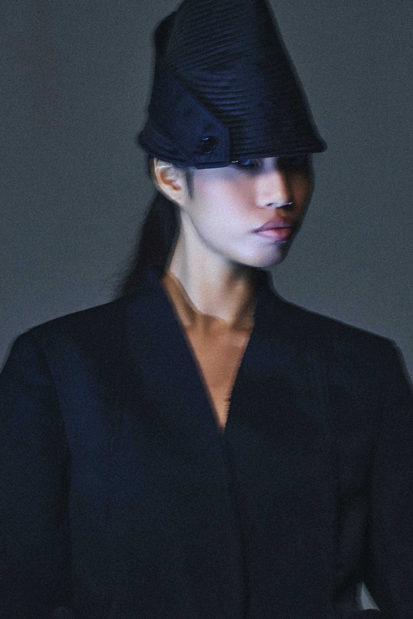 GARMENTS APPEAR FLAT FROM THE FRONT, REVEALING SCULPTURAL VOLUMES IN MOTION. SIGNATURE DRAPING, BOOMERANG DETAILS, AND A REIMAGINED BAR JACKET CREATE MODULAR, ARMOUR-LIKE SILHOUETTES, GROUNDED IN CRAFT AND DESIGNED TO BE QUESTIONED AND RE-SEEN.
