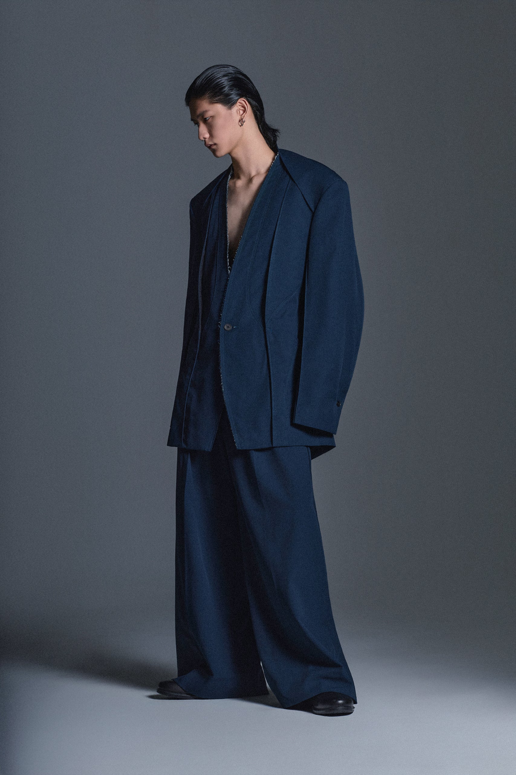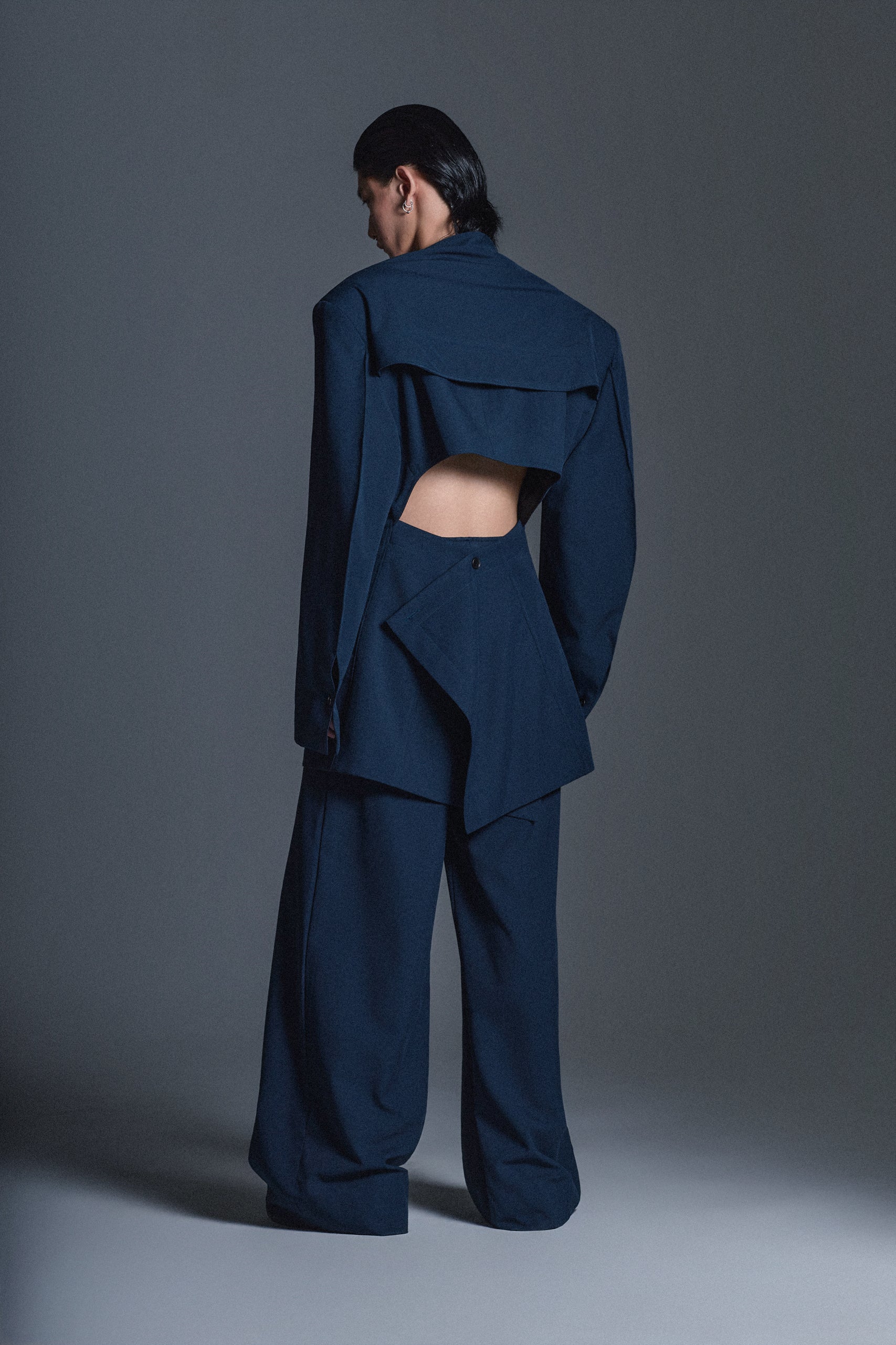 THIS DECONSTRUCTED BLAZER FEATURES A TECHNICAL CONSTRUCTION, UTILIZING A MULTI-LAYERED APPROACH, WITH INTEGRATED PANELS THAT CREATE AN ASYMMETRIC, LAYERED EFFECT ACROSS THE TORSO. FINISHED WITH SHARP SHOULDERS AND A SIGNATURE WAIST-LEVEL BACK CUT-OUT, IT OFFERS A MODERN, HIGH-TECH TAKE ON ARCHITECTURAL TAILORING.
