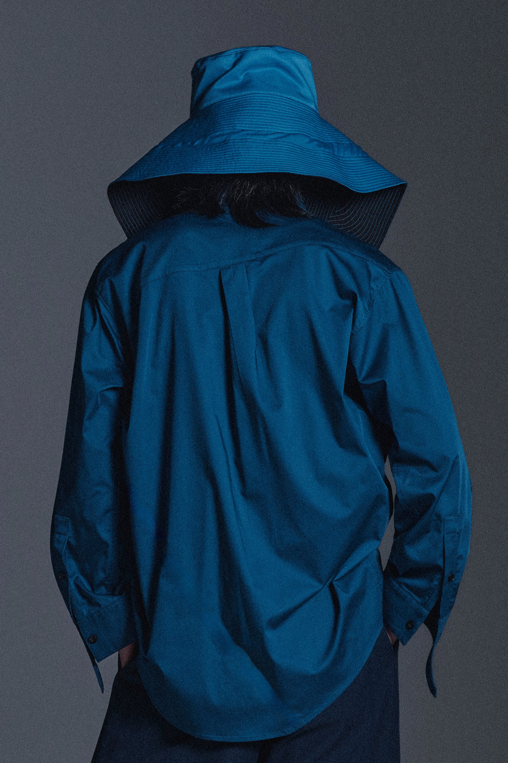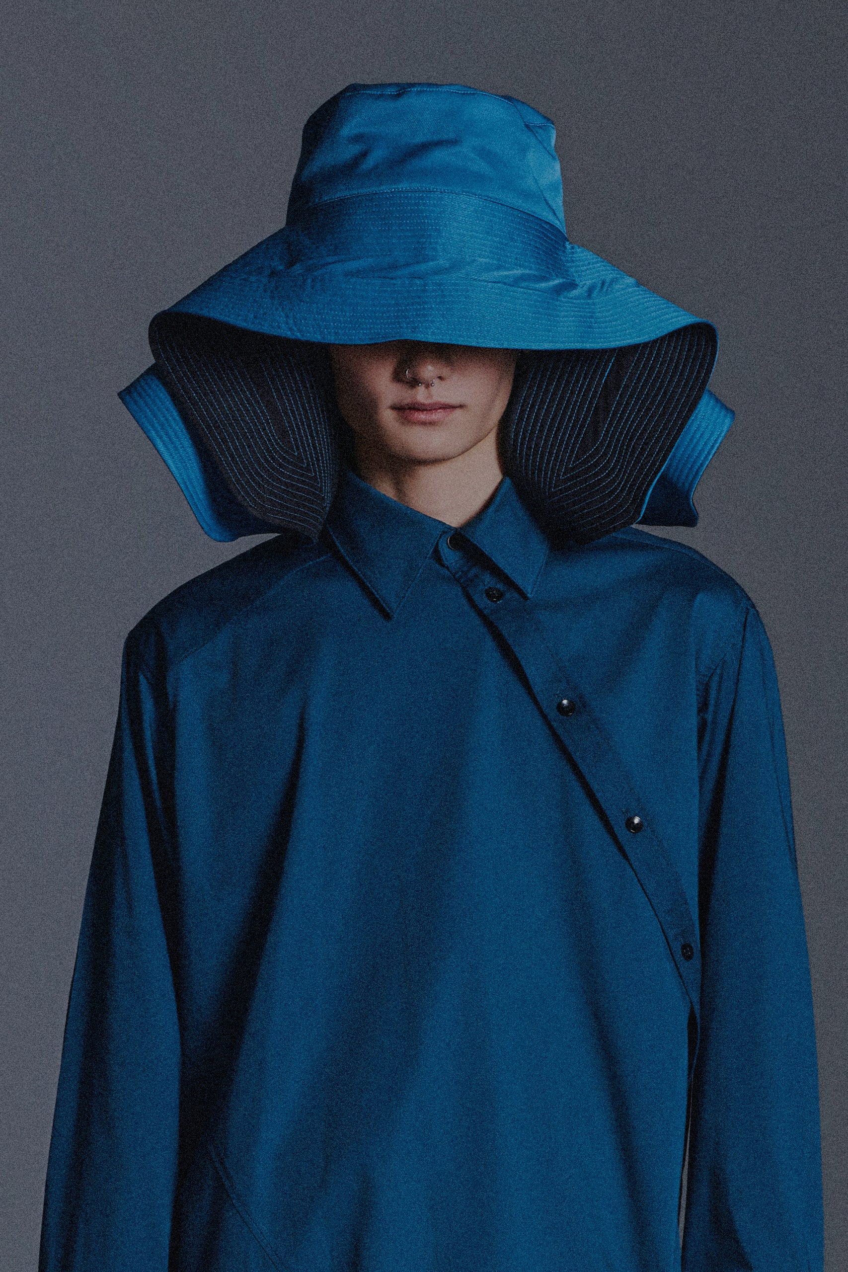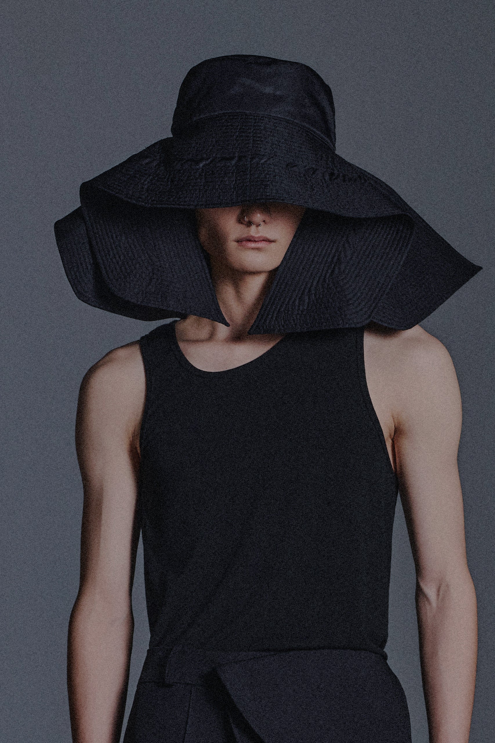 AN OVERSIZED HAT FEATURING A DRAMATIC, WIDE BRIM WITH TOP-STITCHED DETAILING, ECHOING OUR RTW25 SIGNATURE BOOMERANG DETAIL. THE SCULPTURAL PROPORTIONS CREATE A BOLD SILHOUETTE WHILE MAINTAINING A REFINED, TECHNICAL EDGE.