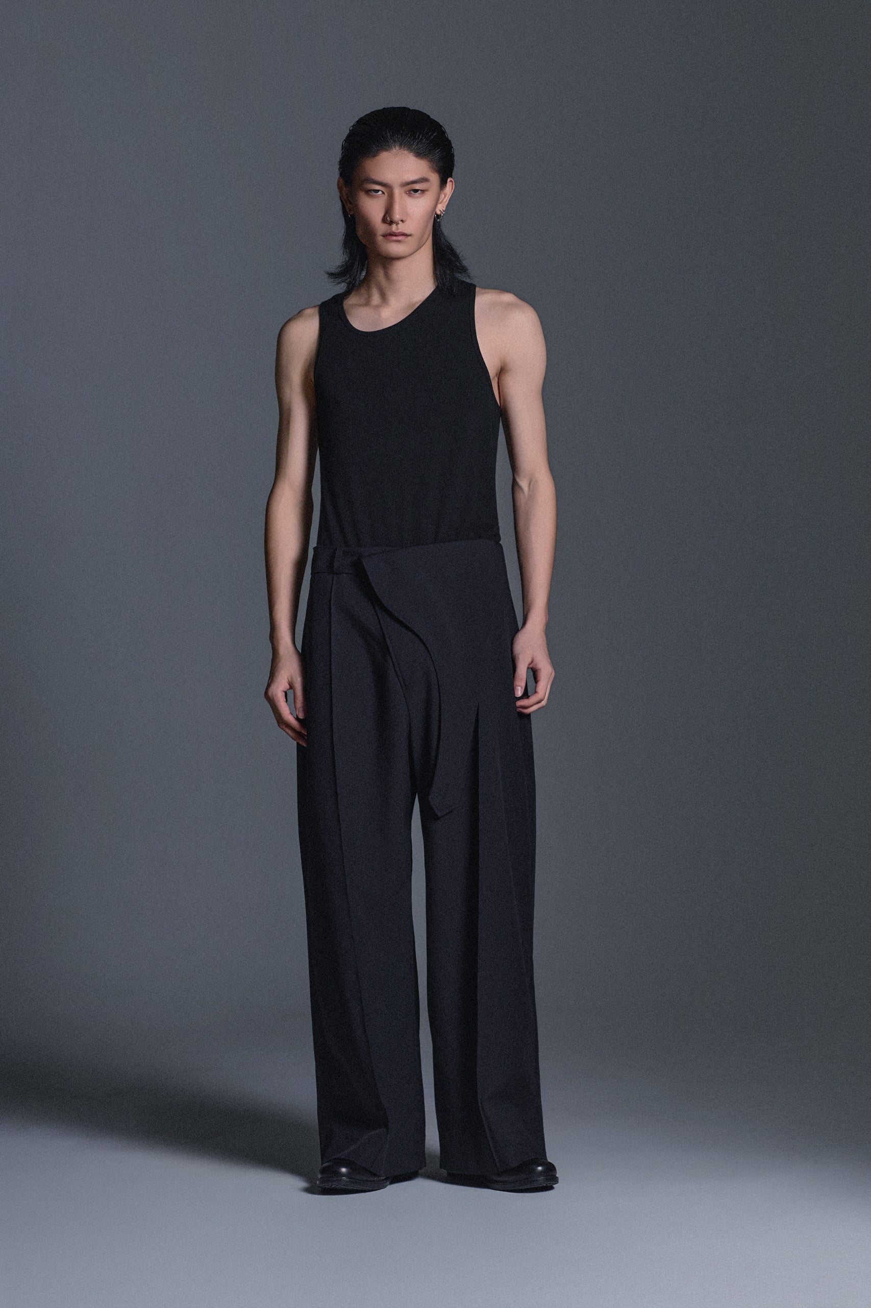 A TAILORED TROUSER DESIGNED WITH A SHIFTED CENTER FRONT FOR A SUBTLE DISRUPTION OF CLASSIC STRUCTURE. FEATURING THE RTW25 SIGNATURE BOOMERANG DETAIL AT THE WAIST OFFERING A SHARP, TAILORED LOOK WITH A DISTINCTIVE TWIST.