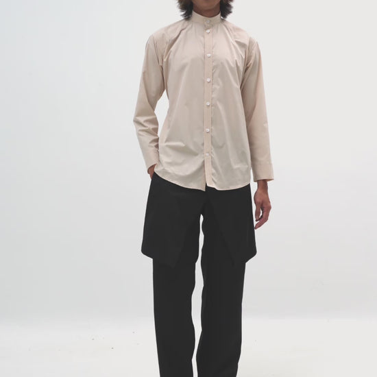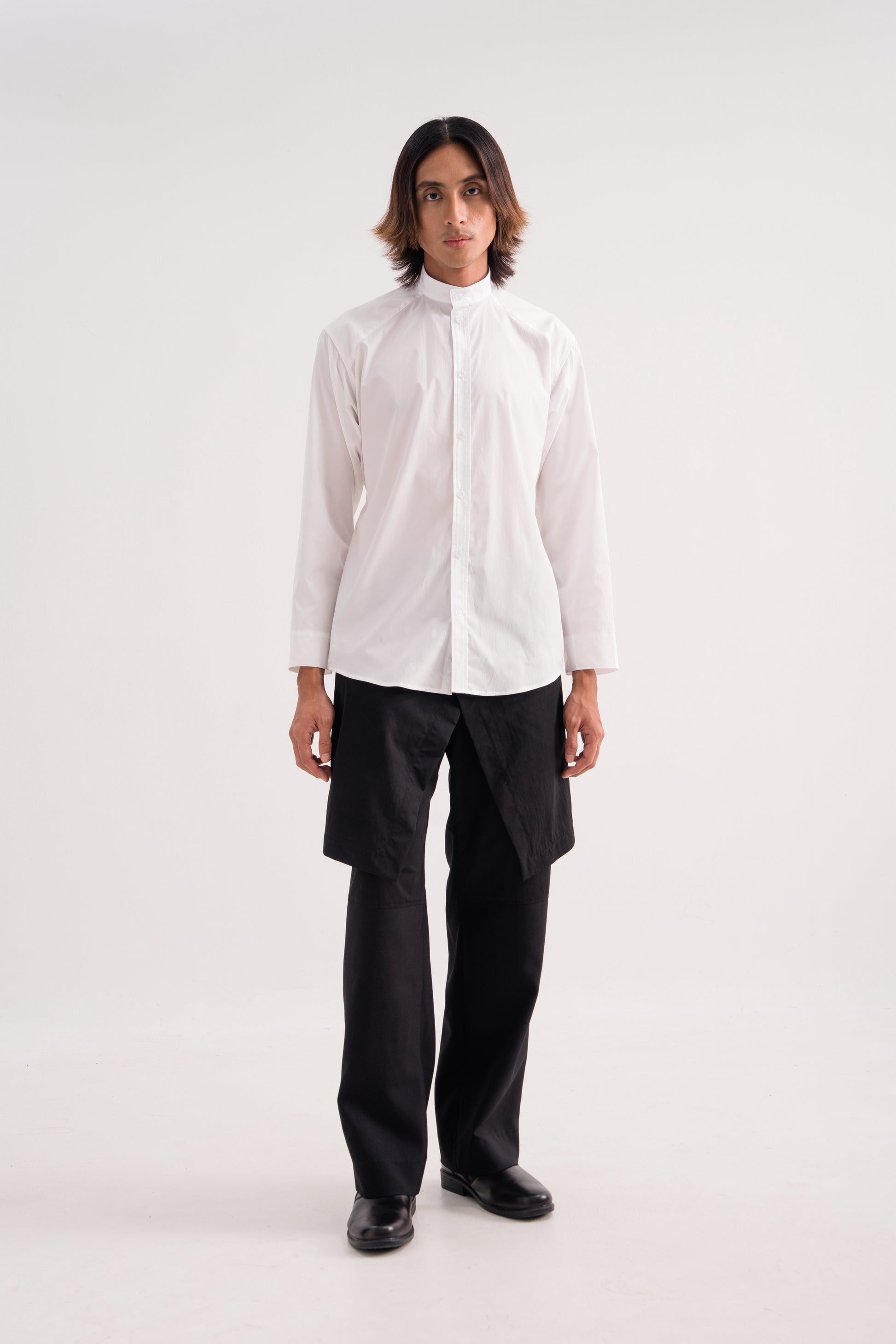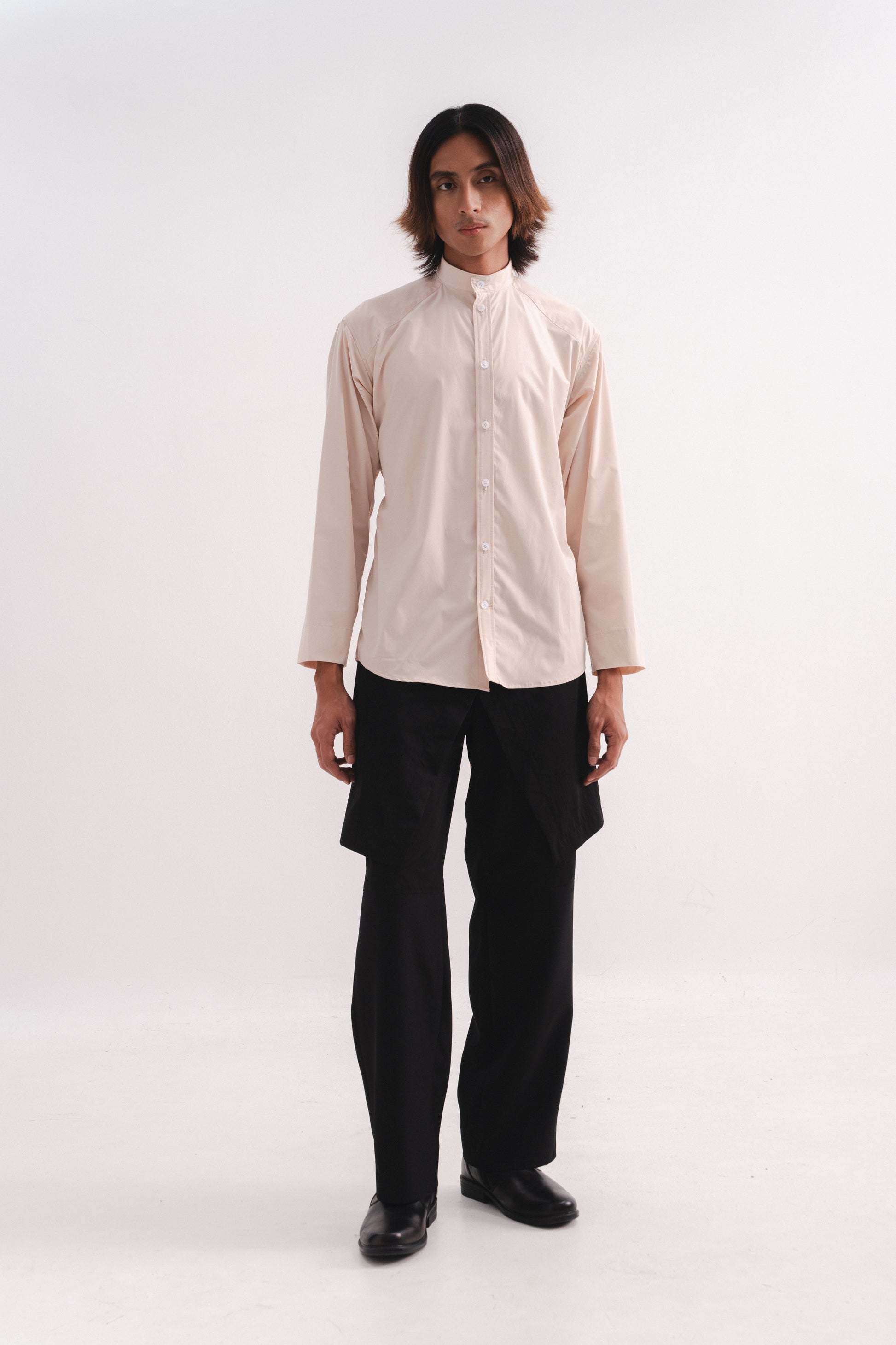 A RELAXED LONG-SLEEVE SHIRT WITH A STAND COLLAR AND STRUCTURED SHOULDER PANELLING. FEATURES A BACK YOKE AND AN ATTACHED SIDE-SEAM BELT FOR AN ADJUSTABLE FIT. FINISHED WITH A STANDARD FRONT BUTTON OPENING FOR A CLEAN, MODERN LOOK.
