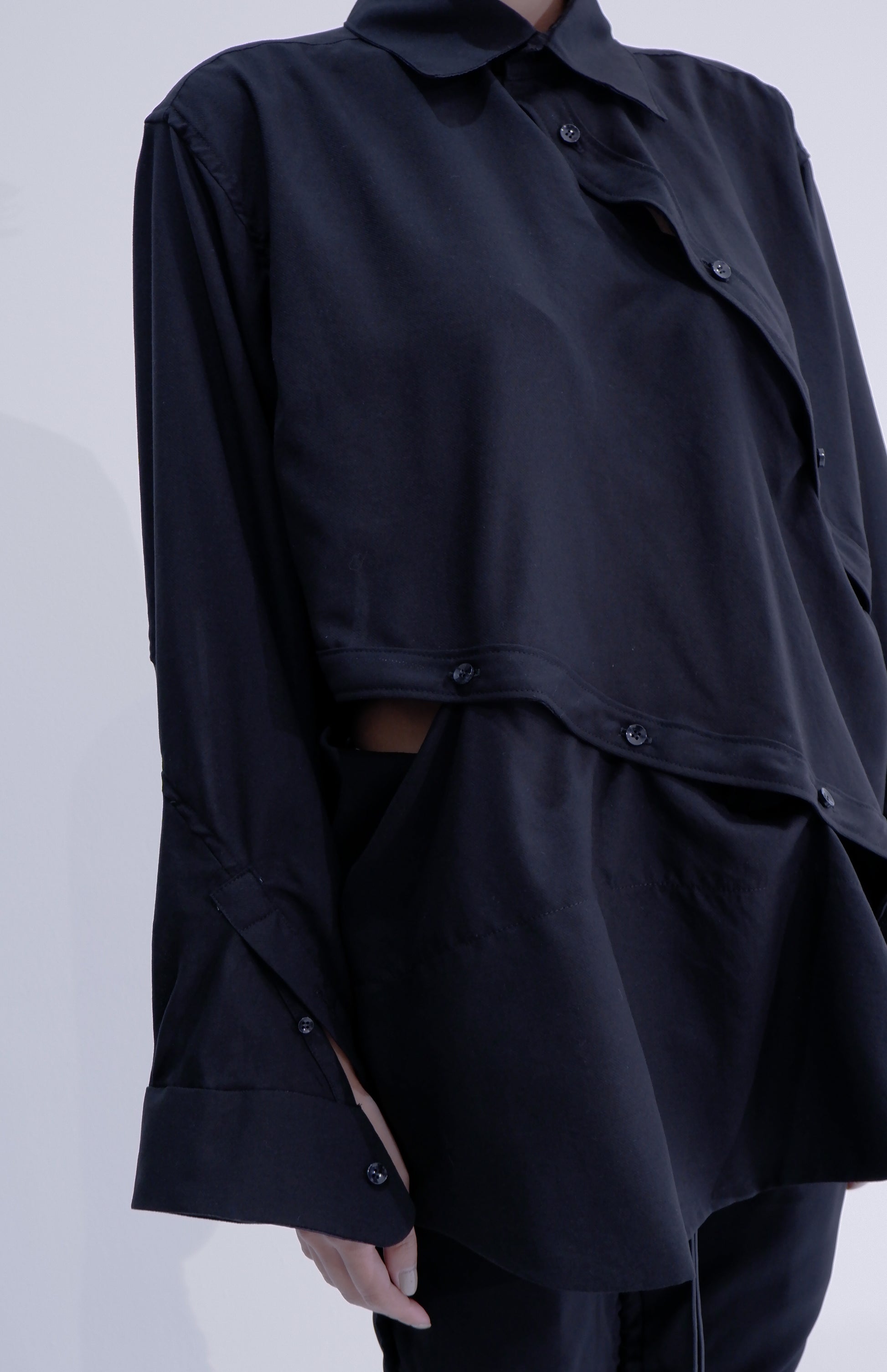 A RELAXED-FIT SHIRT WITH A TWIST. FEATURES A TWISTING SHIRT PLACKET THAT GOES AROUND THE BODY.
