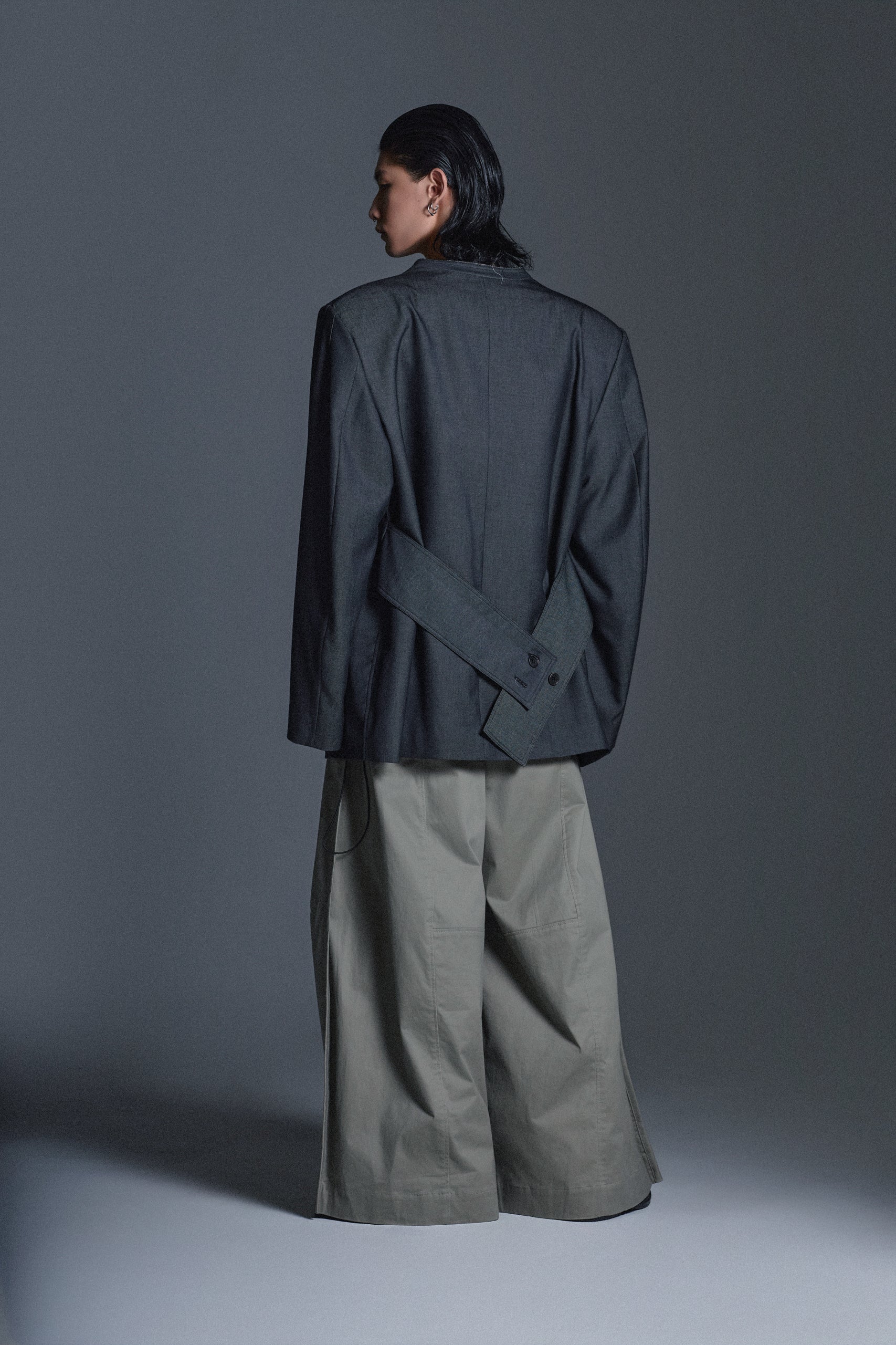 A MODERN TAKE ON THE TRADITIONAL BLAZER IN A SOFT CONTRAST TWILL WOOL BLEND. THE MINIMALIST DESIGN FEATURES A COLLARLESS NECKLINE AND A WIDE BELT FOR AN ADJUSTABLE FIT AND STYLE.